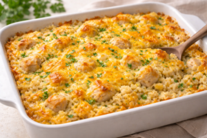 When you’re craving something warm, filling, and deeply satisfying, few dishes hit the spot like cheesy baked chicken and rice. It’s the kind of comfort food that feels like a hug on a plate—creamy rice, tender chicken, and melted cheese all baked together into one cozy dish.
