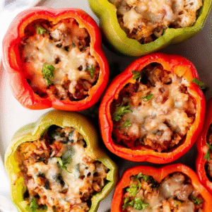 These stuffed bell peppers with ground beef are a wholesome and colorful dinner that’s as delicious as it is beautiful. Filled with a savory beef and rice mixture, topped with cheese, and baked to perfection, this easy recipe makes a satisfying family meal any night of the week.